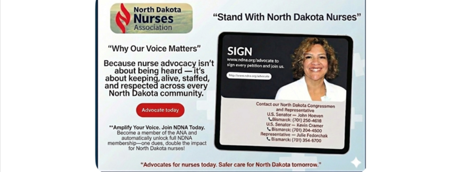 The North Dakota Nurses Association (NDNA) is a 501(c)(6) non-profit. We are the only professional organization representing all nurses in North Dakota. The mission of NDNA is to advance the nursing profession by promoting the professional development of nurses, fostering high standards of nursing practice, promoting the safety and well-being of nurses in the workplace, and advocating on health care issues affecting nurses and the public.