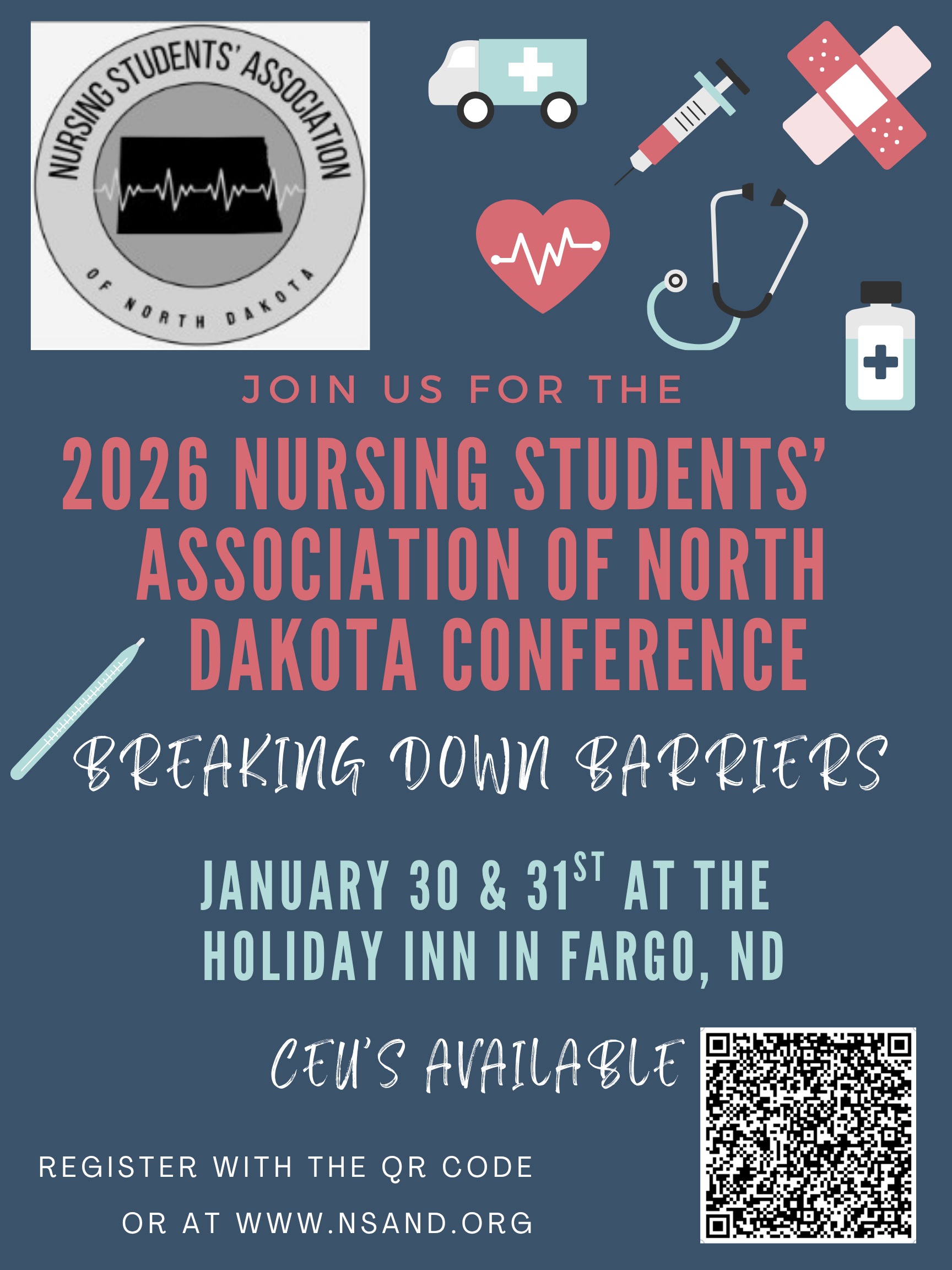 Please join the North Dakota Student Nurses' Association at their 2026 conference in Fargo on January 30-31st at the Holiday Inn. CEUs are being offered.